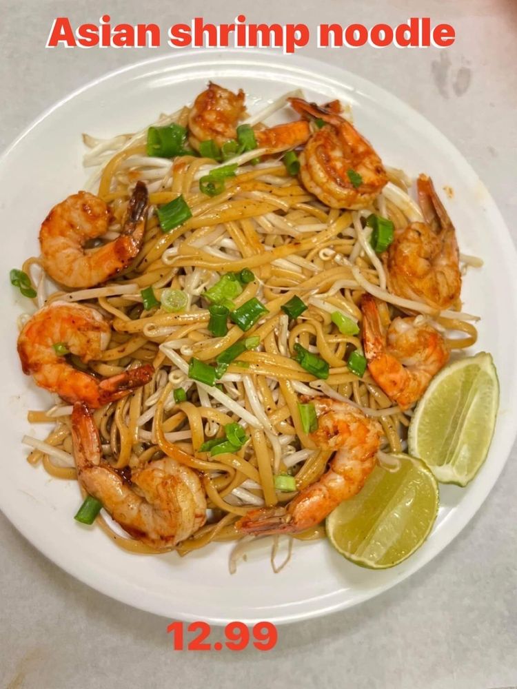 Tender shrimp and fresh broccoli stir-fried with lo mein noodles in a savory sauce.