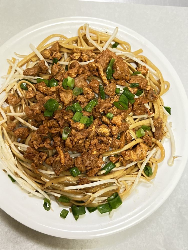 Tender chicken pieces stir-fried with soft lo mein noodles, fresh bean sprouts, and chopped green onions.